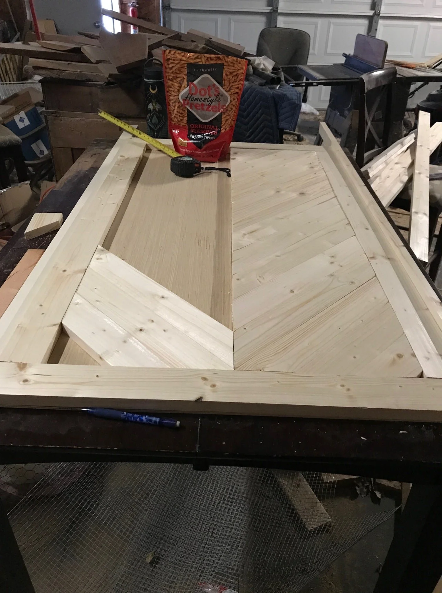 While he worked with the electronics, I was busy on the accent piece for the whole design. This patterned wooden hanging door would hide all the shelves with the electronics and serve as the mount for the bedroom television.