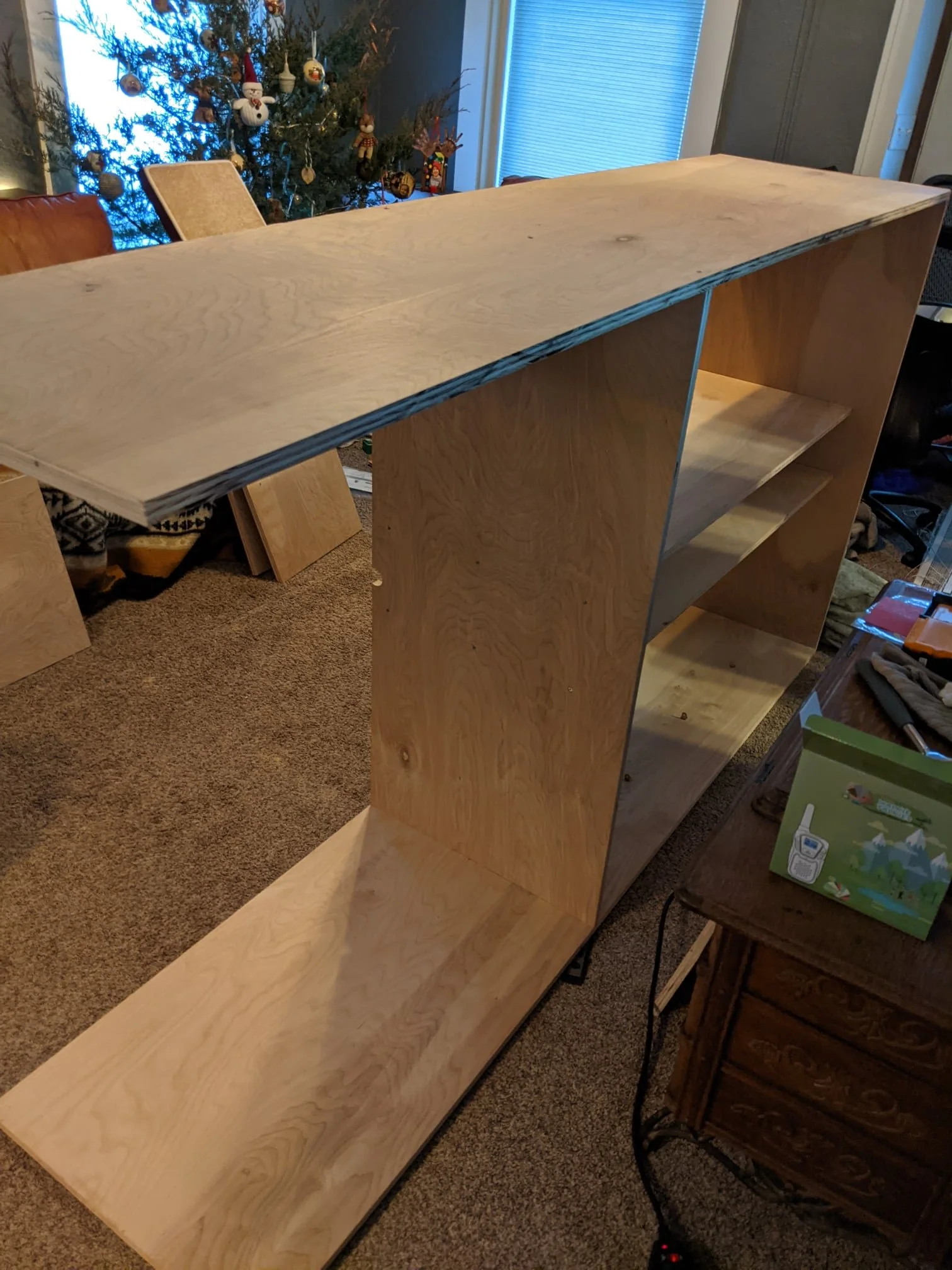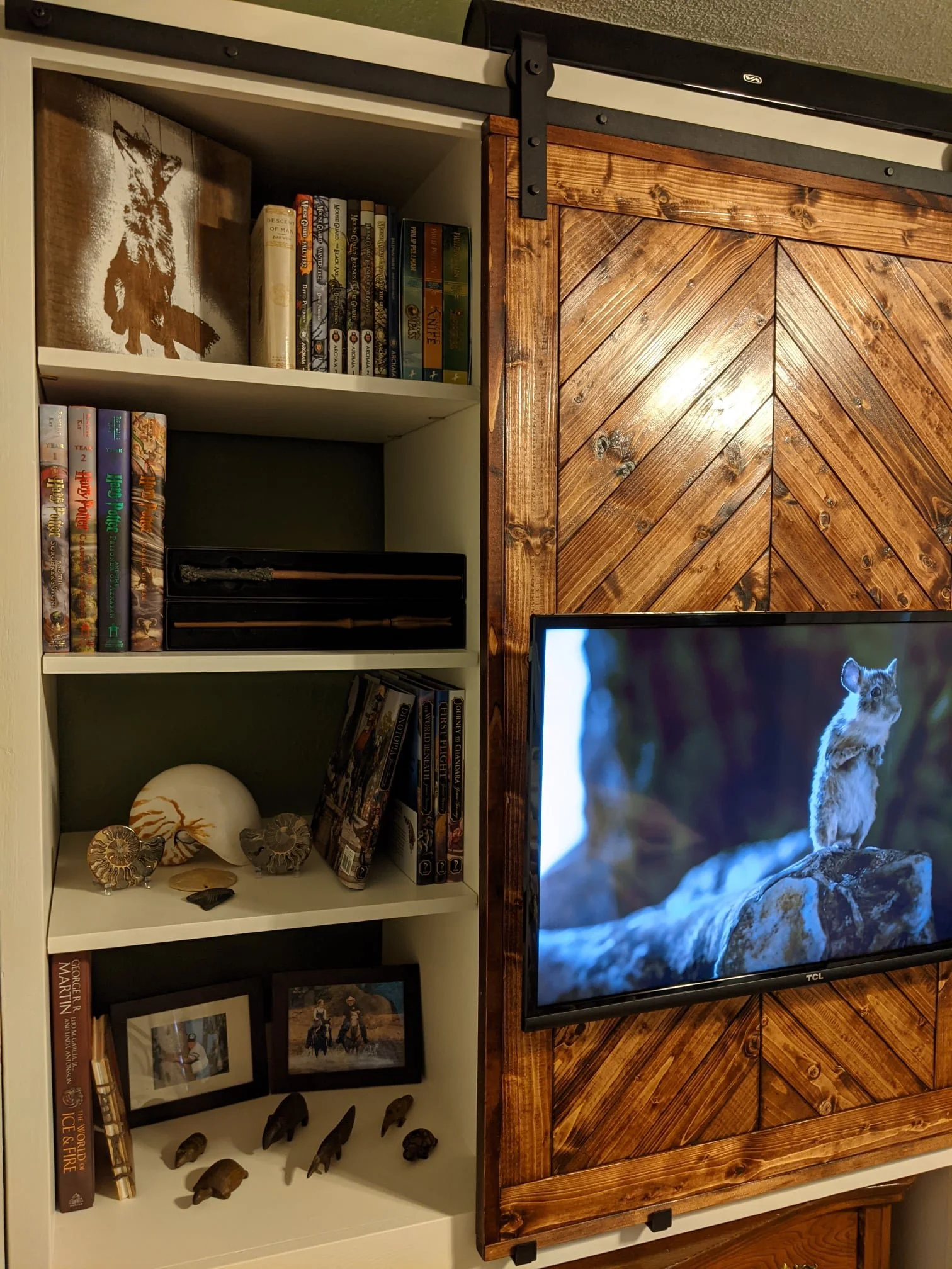 And success! We had a finished entertainment center. We filled the left side with some of our favorite books and knick-knacks. Most we still had packed away since we moved here. Feels great to have them back. This also shows how that secret middle compartment is never visible. Exactly as we envisioned it.