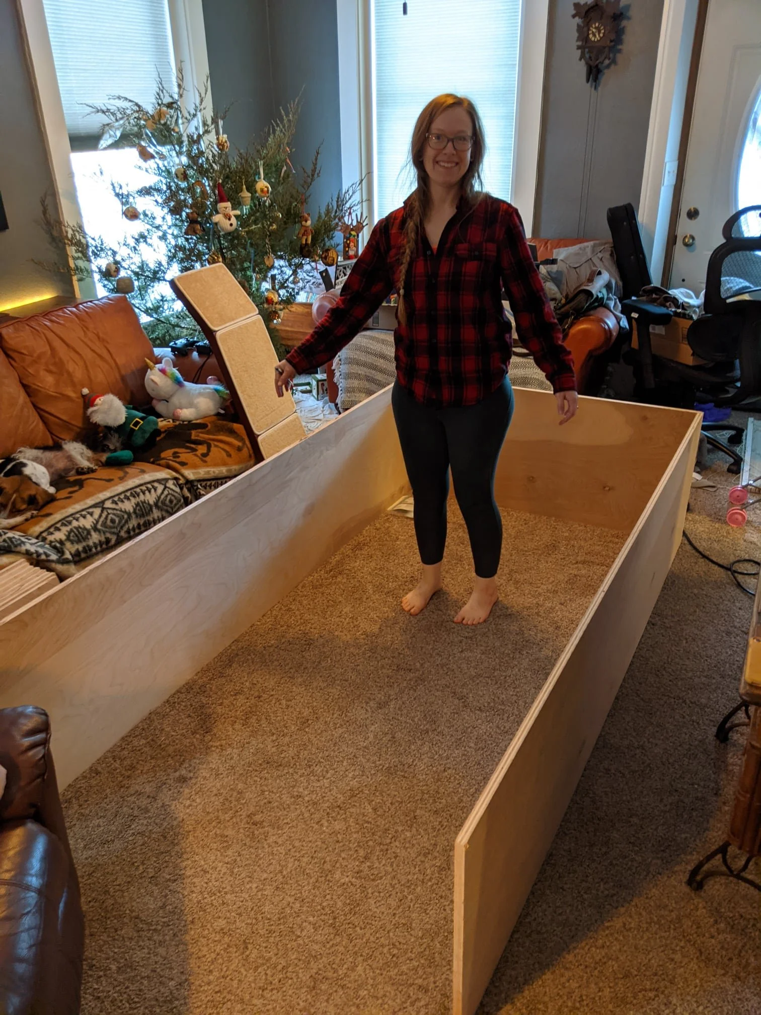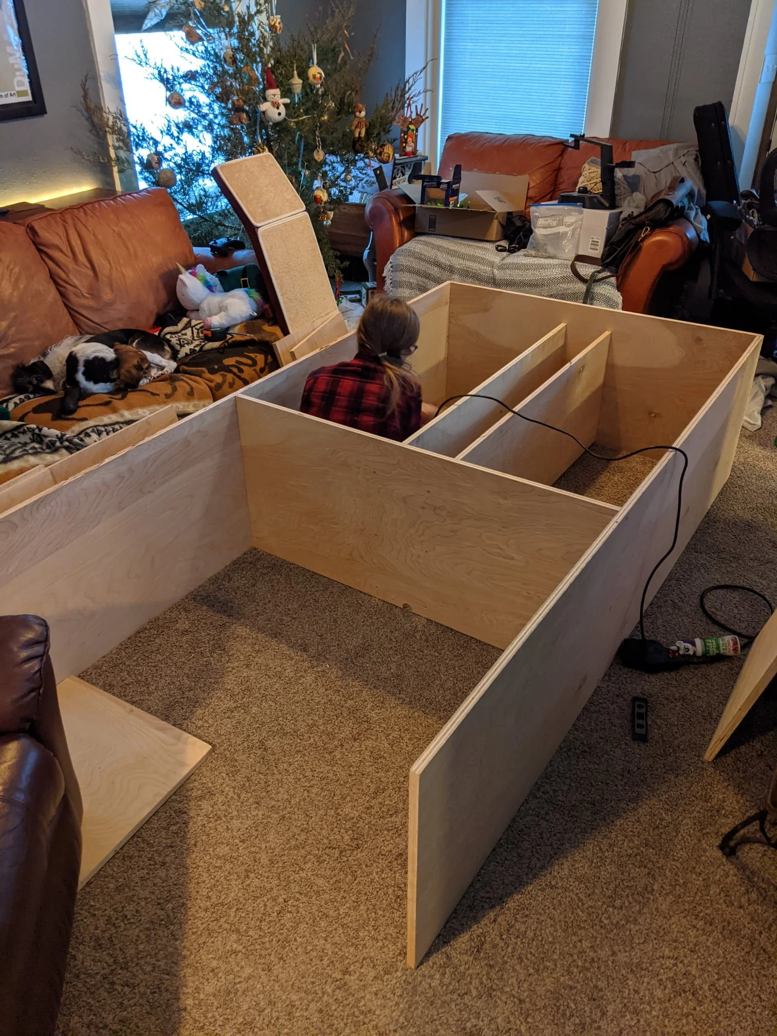 After the demolition was completed we could start the main build. Thankfully, our living room was just large enough to build the frame laying down. It was a bit too cold to do the construction outside and it was going to be much easier to maneuver into place from just one room over.