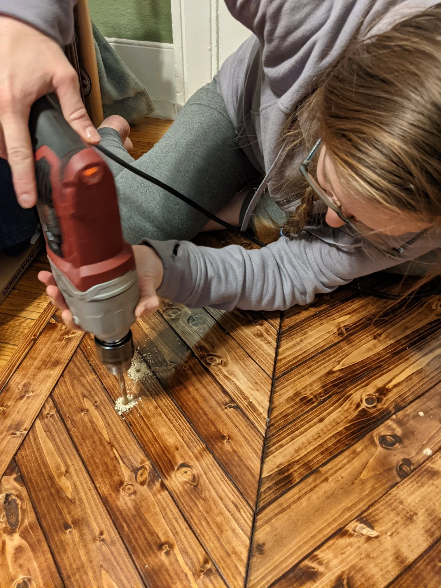 This was probably the hardest part of the entire build. Installing a sliding barn door rail is quite difficult. There are a lot of moving pieces and if you don't get it just right then the door doesn't look straight. We thought for a long time that we measured something wrong, because the door was askew by about a half an inch. Turns out that the entertainment center itself was leaning slightly to the right. So to fix that we anchored the whole thing to the left wall with a couple well placed screws. That drew the whole thing back into alignment and would also make sure that it never tips over.