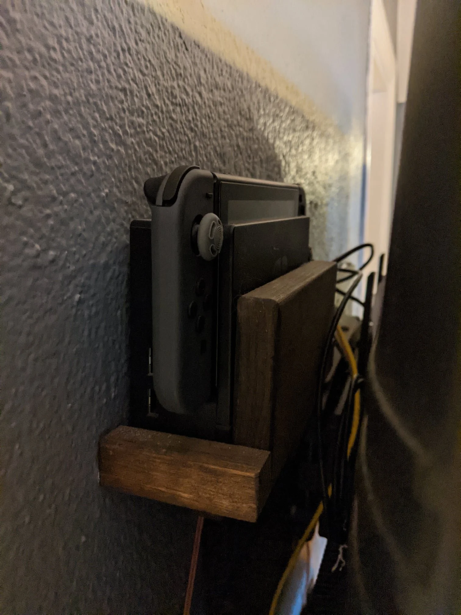 Bonus project: This little Switch dock mount is hidden behind the living room TV. Keeping it in the entertainment center causes issues because the thickness of the wall interferes with the joy-con signals. There is another dock in the entertainment center if you want to play the Switch on the bedroom TV.