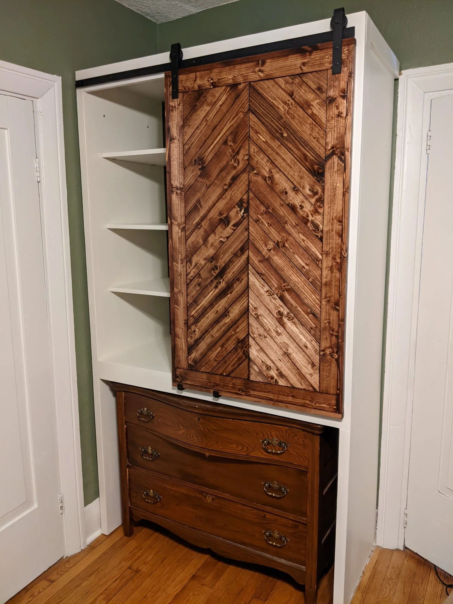 Over the next three years my husband’s ideas for the space slowly evolved until he eventually put his design skills to work and created a mockup of a multi-purpose entertainment center. Then finally, during the winter of 2020 the opportunity arose for us to make this dream a reality. When we were done we had a 7 foot tall combination clothes dresser, bookshelf, and entertainment center that powered two TVs in different rooms! Here’s how we did it.